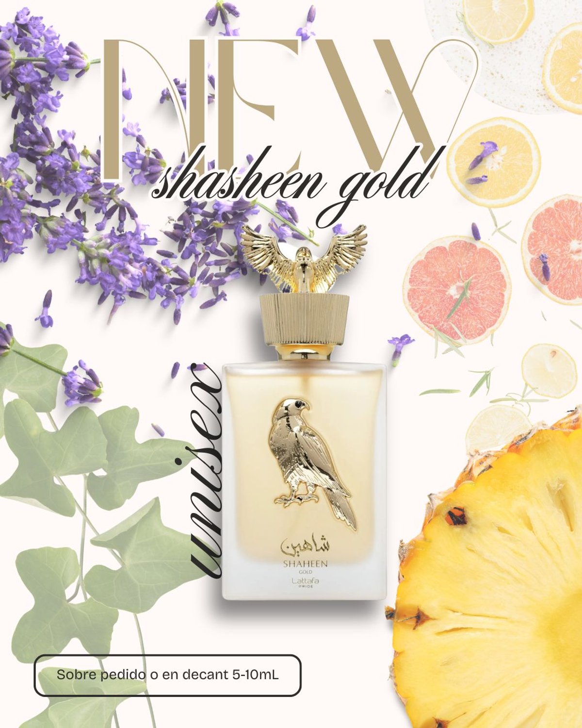 Shaheen Gold no es para cualquiera. Es una fragancia imponente, inspirada en la fuerza y la elegancia del halcón real. Es un aroma frutal-ambarado que logra el equilibrio perfecto entre la dulzura exótica y una base terrosa y potente. Si buscas un perfume que huela a "oro líquido", este es el indicado.